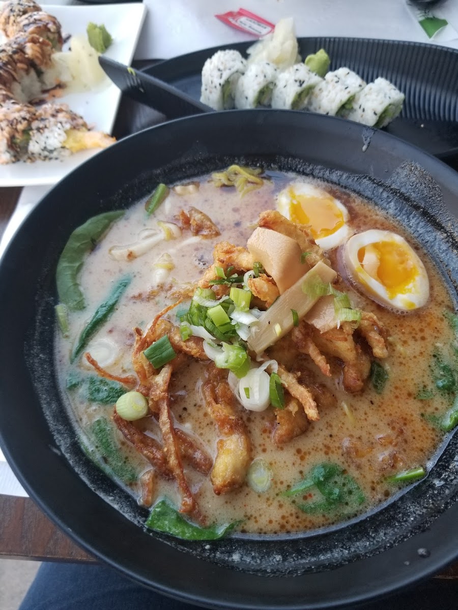 Sachi Ramen & Robata Bar is known for its mouth-watering menu, featuring a variety of dishes that cater to all tastes. One standout option is the Spicy Crispy Chicken Black Garlic Ramen. This bowl of ramen features tender, crispy chicken paired with a rich, flavorful black garlic broth that packs a punch of umami. For those seeking something lighter, the Miso Soup is a soothing, savory classic, perfect as an appetizer or enjoyed on its own.